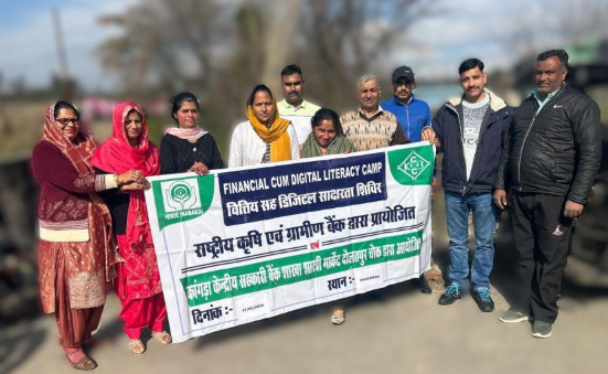 दौलतपुर चौक: कांगड़ा केंद्रीय सहकारी बैंक की शास्त्री मार्केट, दौलतपुर चौक शाखा द्वारा गांव भद्रकाली में वित्तीय साक्षरता शिविर का आयोजन किया गया। शिविर में ग्रामीणों को बैंकिंग सेवाओं, बचत, ऋण योजनाओं और वित्तीय प्रबंधन की विस्तृत जानकारी दी गई।इस अवसर पर शाखा सहायक प्रबंधक संजीव कुमार, सहायक प्रबंधक वरिंदर सिंह सहित बैंक स्टाफ उपस्थित रहा। शिविर को संबोधित करते हुए सहायक प्रबंधक वीरेंद्र सिंह ने किसानों से किसान क्रेडिट कार्ड (केसीसी) व पशुपालन क्रेडिट कार्ड योजनाओं का अधिक से अधिक लाभ उठाने का आह्वान किया। उन्होंने महिलाओं को स्वयं सहायता समूह बनाकर बैंक ऋण के माध्यम से स्वरोजगार अपनाने और आत्मनिर्भर बनने के लिए प्रेरित किया। शिविर में बड़ी संख्या में ग्रामीणों ने भाग लेकर जानकारी प्राप्त की।