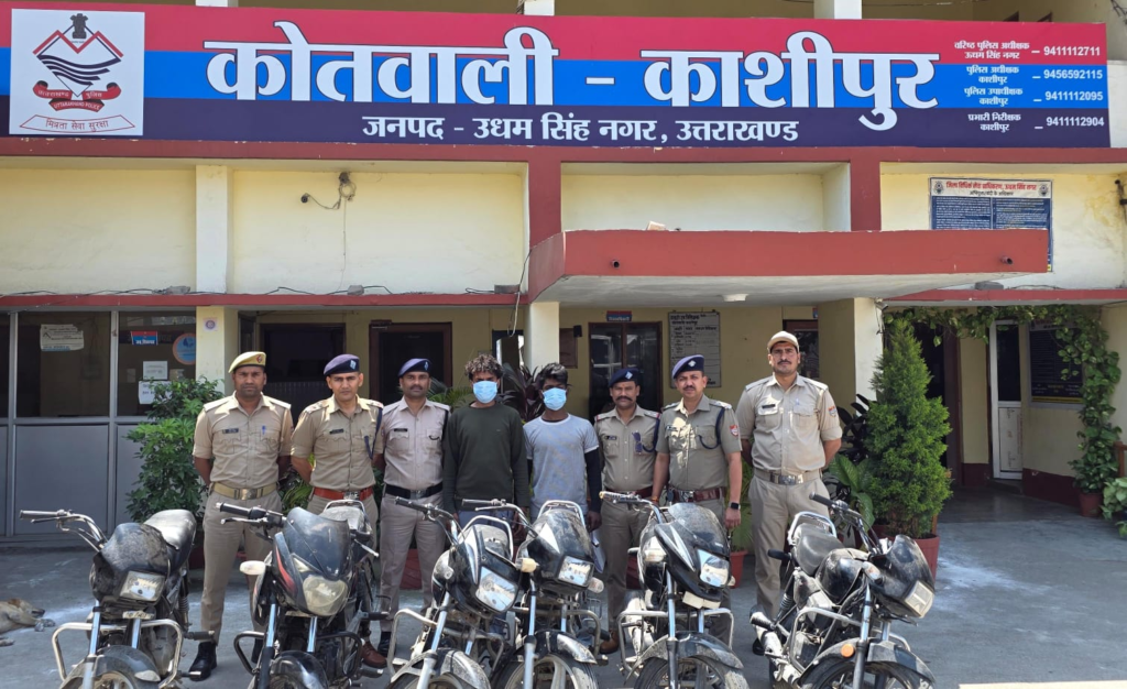 कोतवाली काशीपुर क्षेत्र से विगत दिनो घटित मोटरसाईकिल चोरी की घटनाओ के अनावरण हेतु श्रीमान वरिष्ठ पुलिस अधीक्षक महोदय, ऊधमसिंहनगर के द्धारा दिये गये आदेश-निर्देशो के क्रम मंं तथा श्रीमान पुलिस अधीक्षक काशीपुर एवं पुलिस उपाधीक्षक काशीपुर/बाजपुर महोदय के दिशा निर्देशन में मोटर साइकिल चोरी की घटनाओ के अनावरण हेतु प्रभारी निरीक्षक कोतवाली काशीपुर श्री हरेंद्र चौधरी के द्वारा पुलिस टीम का गठन किया गया । मोटर साईकिल चोरी की घटनाओ के अनावरण हेतु गठित पुलिस टीम के द्वारा सुरागरसी -पतारसी करते हुये मुखबिर की सूचना पर दिनाँक 28-03-2026 को गुरुद्धारे के पीछे ईदगाह के सामने आम के बाग को जाने वाले रास्ते काशीपुर में 02 अभियुक्तगणो क्रमशः1- रितेश कुमार उर्फ निक्का पुत्र तेजपाल सिंह निवासी काली माता मन्दिर रोड मौहल्ला भूप सिंह थाना जसपुर जिला ऊधमसिंहनगर उम्र- 25 वर्ष लगभग तथा 2-विशाल दिवाकर उर्फ कालू पुत्र स्व0 रघुवीर दिवाकर निवासी पशुपति बिहार कालौनी थाना आईटीआई जिला ऊधमसिंहनगर उम्र – 24 वर्ष को गिरफ्तार किया गया तथा अभियुक्तगणो के कब्जे से कोतवाली काशीपुर पर पंजीकृत मुकदमा एफआईआऱ नं0 107/2026 धारा 303(2) बीएनएस व मुकदमा एफआईआर नं0 109/26 धारा 303(2) बीएनएस से सम्बन्धित चोरी गये 02 मोटर साईकिलो के आलावा चोरी की 04 अन्य मोटर साईकिलें (कुल 06 चोरी की मोटर साईकिलो ) के साथ गिरफ्तार कर मोटर साईकिल चोरी की घटनाओ का अनावरण किया गया है । गिरफ्तार अभियुक्तगणो के विरुद्ध आवश्यक वैधानिक कार्यवाही कर माननीय न्यायालय में पेश किया जा रहा है रितेश कुमार उर्फ निक्का पुत्र तेजपाल सिंह निवासी काली माता मन्दिर रोड मौहल्ला भूप सिंह थाना जसपुर जिला ऊधमसिंहनगर उम्र- 25 वर्ष लगभग