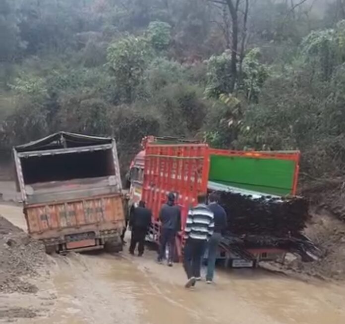 घुमारवीं–सरकाघाट रोड बंद,सड़क में धंसे दो ट्रक