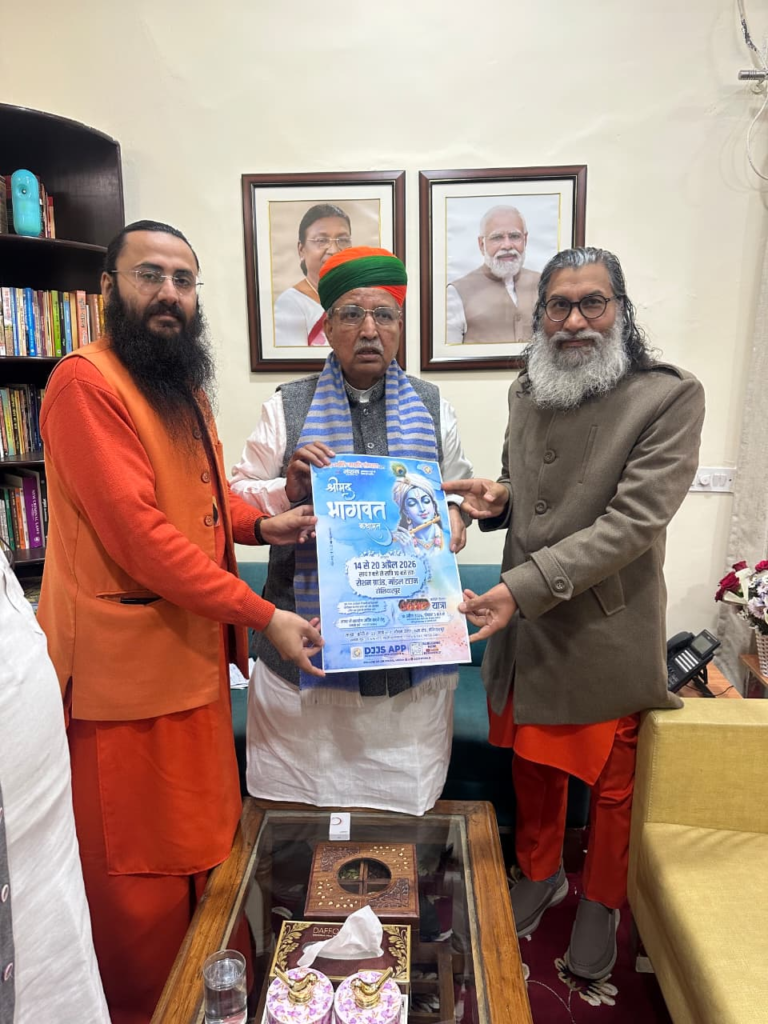 दिव्य ज्योति जाग्रति संस्थान (DJJS) एवं समस्त होशियारपुर निवासियों के सामूहिक सहयोग से आगामी अप्रैल माह में आयोजित होने जा रही सात दिवसीय भव्य ‘श्रीमद् भागवत कथामृत’ के मंगलमय निमंत्रण की कड़ी में आज एक विशेष भेंट की गई। संस्थान के प्रतिनिधियों द्वारा भारत सरकार के माननीय केंद्रीय कानून एवं न्याय मंत्री श्री अर्जुन राम मेघवाल जी को इस आध्यात्मिक महोत्सव का विधिवत निमंत्रण पत्र भेंट कर आमंत्रित किया गया।