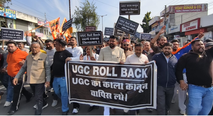 हिमाचल प्रदेश के ऊना जिले में सोमवार को UGC बिल के विरोध में सवर्ण समाज ने जोरदार विरोध प्रदर्शन किया। दलगत राजनीति से ऊपर उठकर सवर्ण समाज के लोग सड़कों पर उतरे और रोष मार्च निकालकर केंद्र सरकार के खिलाफ जमकर नारेबाजी की। इस प्रदर्शन में विभिन्न धार्मिक व सामाजिक संगठनों ने भी सवर्ण समाज का समर्थन करते हुए भाग लिया।